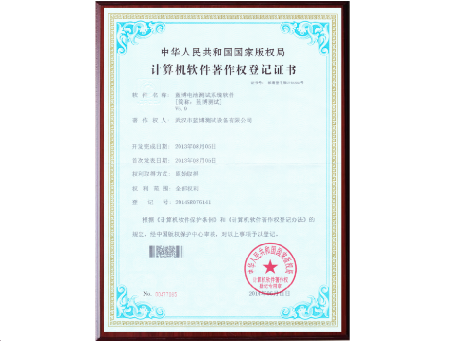 根據(jù)《計(jì)算機(jī)軟件保護(hù)條例》和《計(jì)算機(jī)軟件著作權(quán)登記辦法》的規(guī)定,經(jīng)中國版權(quán)保護(hù)中心審核,中華人民共和國國家版權(quán)局對(duì)藍(lán)博公司提交的電池測(cè)試系統(tǒng)軟件著作權(quán)認(rèn)定為原始取得并予以登記,從頒證之日起,這套電池測(cè)試系統(tǒng)軟件的版權(quán)將得到中國版權(quán)保護(hù)中心的有效保護(hù)。