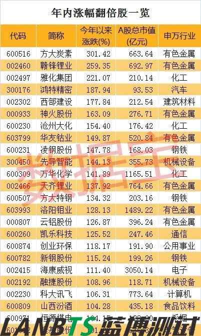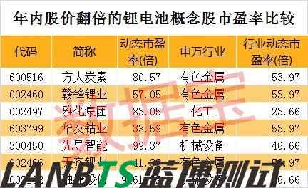 數(shù)據(jù)寶統(tǒng)計顯示,剔除近一年上市的次新股,25只個股年內(nèi)漲幅在100%以上。值得注意的是,7只個股來自鋰電池板塊,分別是方大炭素(600516)、贛鋒鋰業(yè)(002460)、雅化集團、華友鈷業(yè)(603799)、先導智能(300450)、天齊鋰業(yè)(002466)、融捷股份(002192)。